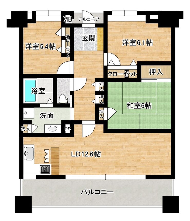 玄関を挟んで左右に配置された洋室(6.1帖・5.4帖)は、家族間でも程よい距離感を保てるプライバシー重視の設計です。